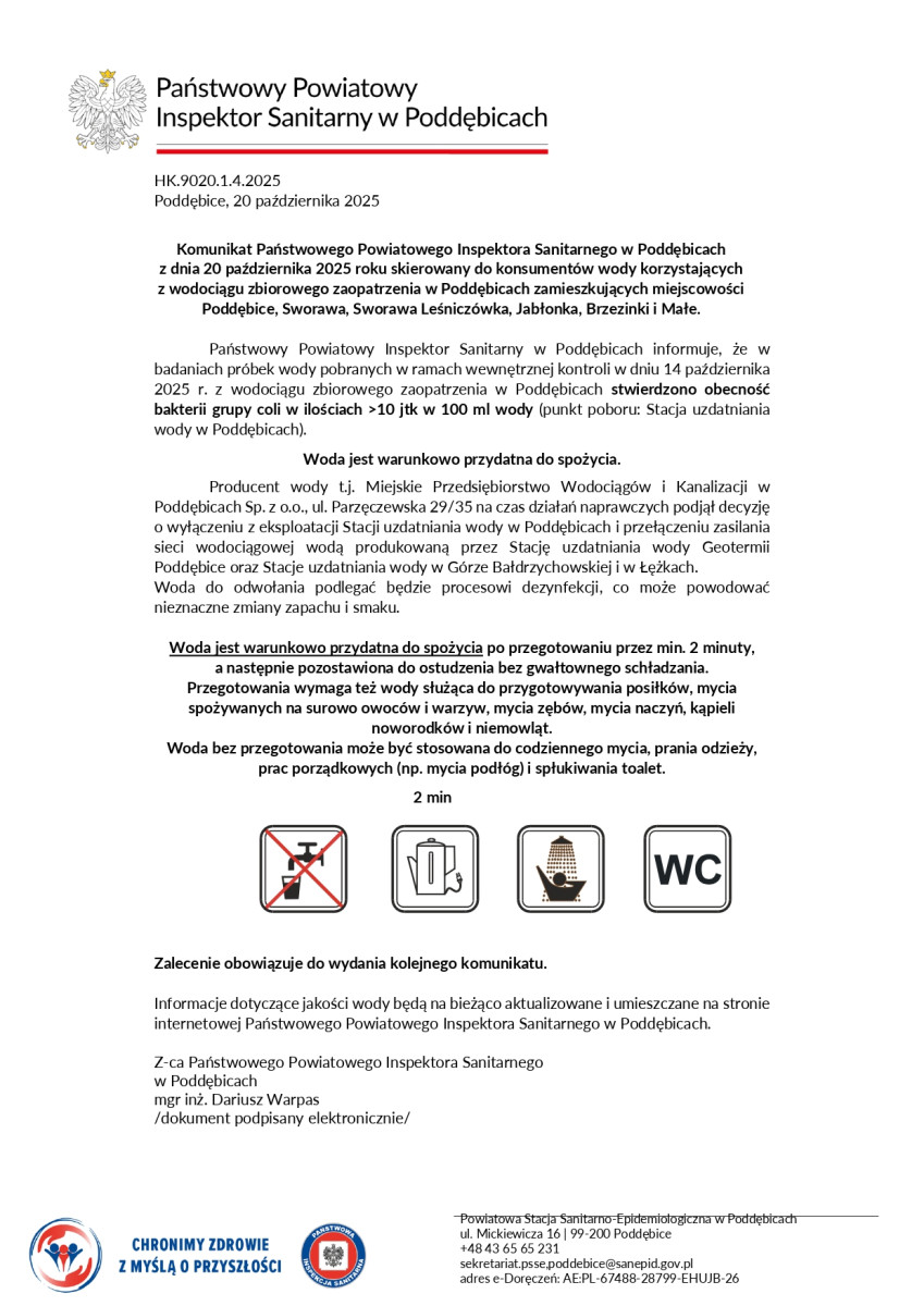 Zgodnie z informacją Sanepidu, próbki pobrane 14 października 2025 r. z wodociągu zbiorowego w Poddębicach wykazały obecność bakterii grupy coli w ilości przekraczającej dopuszczalne normy – powyżej 10 jtk w 100 ml wody. W związku z tym woda z sieci nadaje się do spożycia wyłącznie po przegotowaniu przez co najmniej 2 minuty.