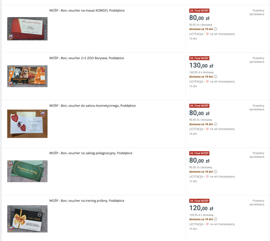 Na aukcjach allegro już teraz można licytować m.in.vouchery: do restauracji, do salonu jubilerskiego, salonu fryzjerskiego, Zoo Borysew, na kurs na prawo jazdy. Obecnie na aukcjach znajdziemy 36 przedmiotów, z których pieniądze wesprą najbliższy finał WOŚP. Sztab zachęca także kolejne osoby, firmy i instytucje do zaangażowania w 34. Finał WOŚP i przekazywania bonów, voucherów i innych darów na licytacje.