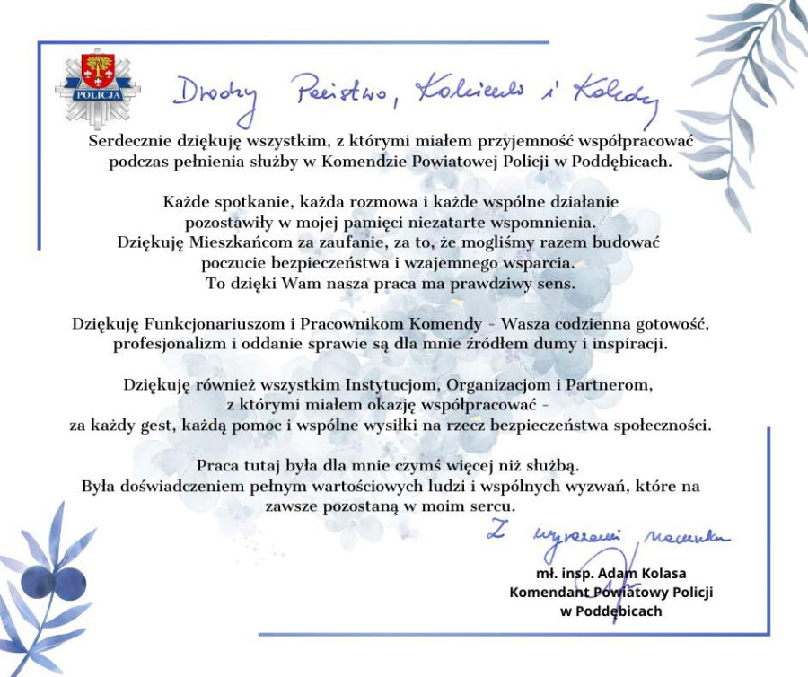 W mediach społecznościowych KPP w Poddębicach Adam Kolasa podziękował mieszkańcom i współpracownikom: