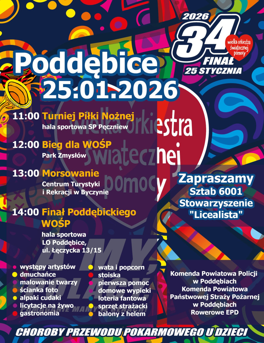 Przed nami kolejny, wyjątkowy Finał Wielkiej Orkiestry Świątecznej Pomocy w Poddębicach! Już 25 stycznia zapraszamy dużych i małych na mnóstwo atrakcji, które odbędą się w różnych miejscach naszego powiatu. Zapowiada się dzień pełen radości, wspólnego pomagania i pozytywnej energii!