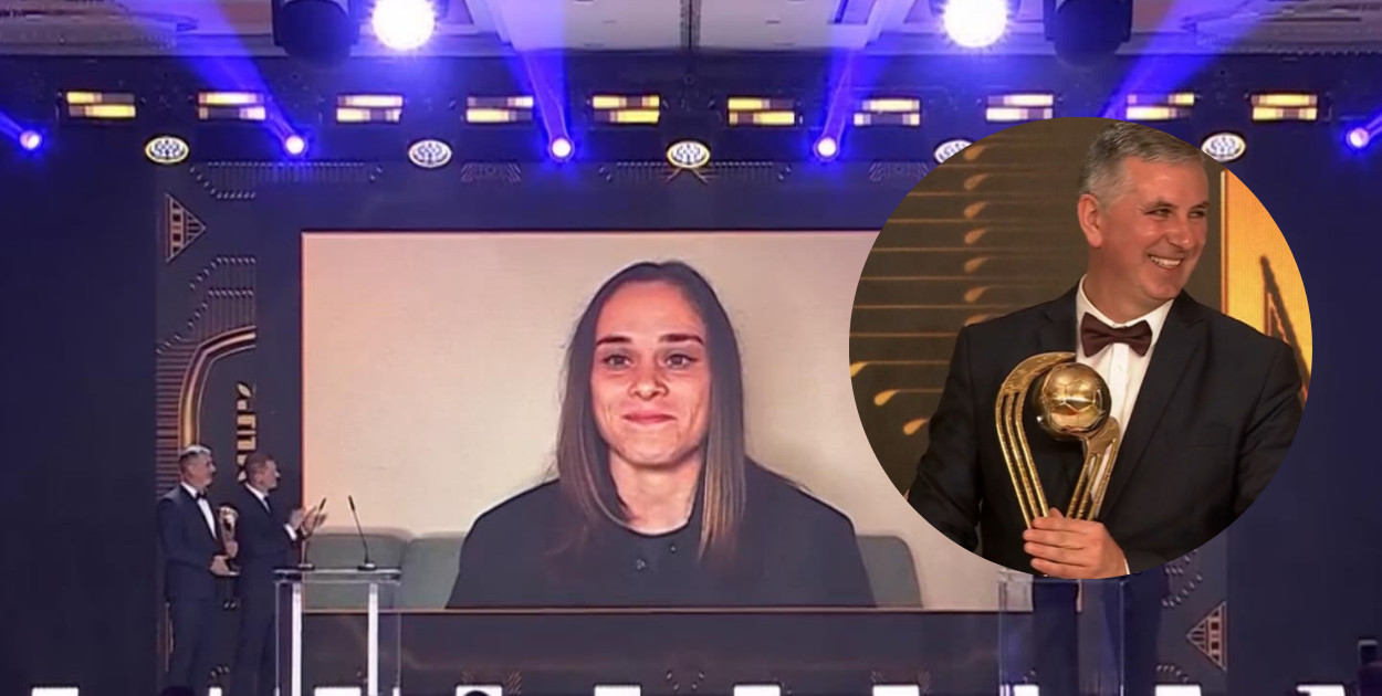 Piłkarka połączyła się z uczestnikami gali za pomocą wideokomunikatora. Nie zabrakło jej podziękowań dla pierwszego trenera Piotra Kozłowskiego, który odbierał statuetkę: